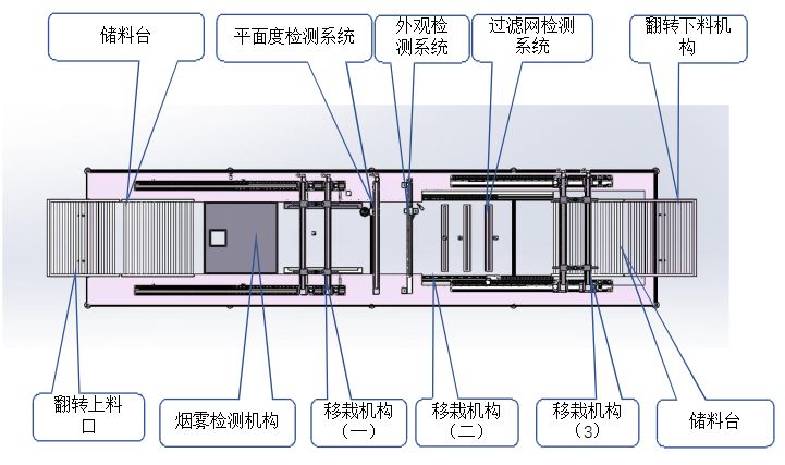 移栽機構(gòu)(二):采用模組根據(jù)產(chǎn)品調(diào)節(jié)寬距,利用模組將產(chǎn)品移動平面、四周瑕疵、過濾網(wǎng)瑕疵工位檢測。